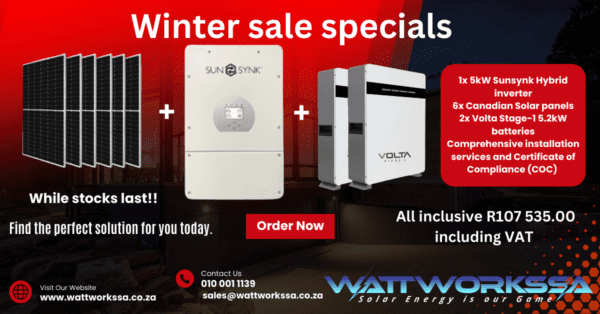 1x Sunsynk 5kW Hybrid Inverter + 2x Volta Stage1 5.12kW LiFePO4 Batteries + 6x 555W Canadian Solar panels Including installation and COC